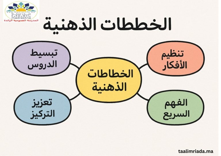 :في موقعنا التعليمي taalimriada.ma نوفر لكم نماذج متنوعة من الخطاطات الذهنية الجاهزة والفارغة، يمكنكم الاستعانة بها في المراجعة، الإعداد للدروس، أو إنجاز ملخصات شخصية. هذه الخطاطات مناسبة للتلاميذ، الأساتذة، وحتى أولياء الأمور الراغبين في تبسيط المعلومات لأبنائهم.